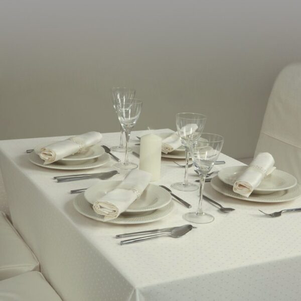 In nuante alb si crem satinat, fata de masa Topo din tesatura Jacquard, ofera un decor rafinat datrorita modelului discret format din buline mici, vizibile in luciul suprafetei.