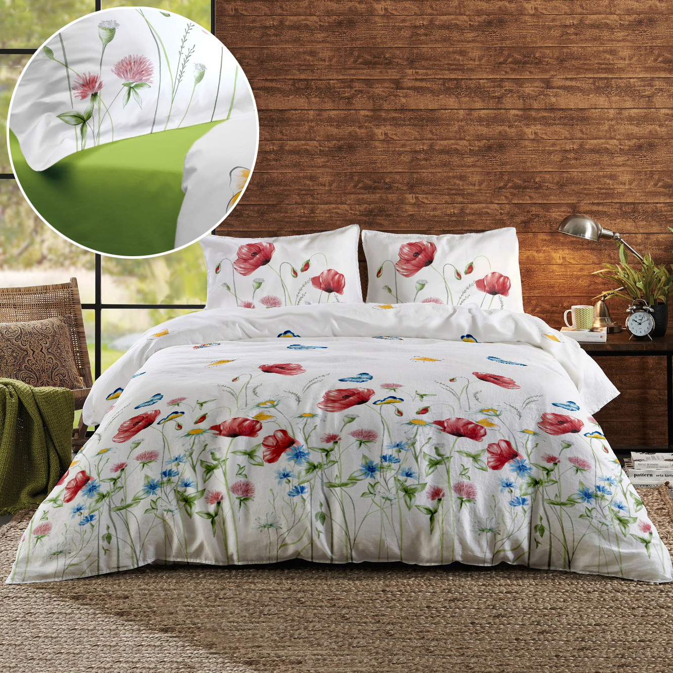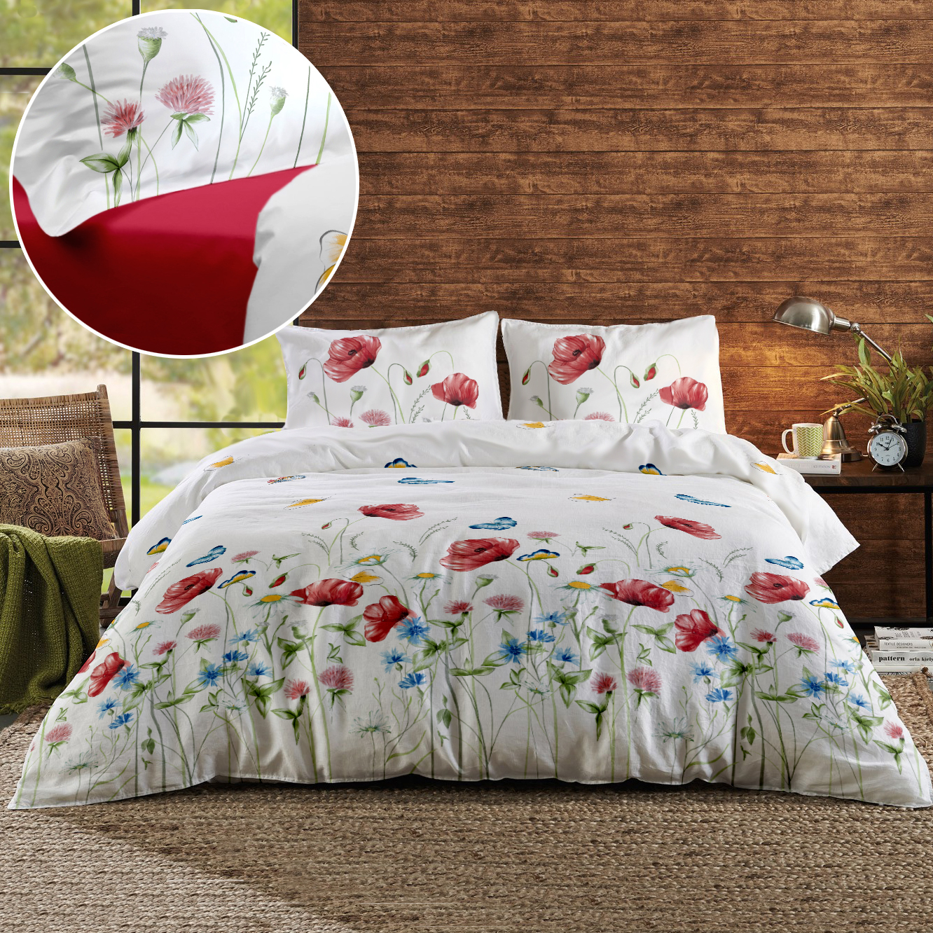 Lenjerie de pat din tesatura naturala, 100% bumbac Renforce. Imprimeul lenjeriei de pat, descrie un camp nesfarsit cu maci in nuante rosu vibrant, printre care se zaresc albastrele in culori vioaie de vara. Lasa-te invaluit de miresmele naturii si de caldura primelor raze de soare.